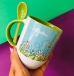 Material: Ceràmica Capacidad: 11 onzas Tamaño: Alto 10 cms Diametro 8 cms. Area de Impresión: Alto 7 cms Ancho 19 cms . Accesorio: Cuchara de ceràmica en color. Técnica: Sublimación