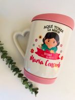 Material: Ceràmica Capacidad: 11 onzas Tamaño: Alto 10 cms Diametro 8 cms. Area de Impresión: Alto 7 cms Ancho 19 cms . Tapa: Plàstico tipo silicona. Técnica: Sublimación